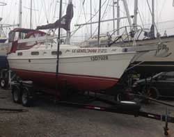 HUNTER 26.5', 1988![]() Avec ou sans remorque tandem de marque Profil 1990. Remise à neuf au complet (suspension à air, freins hydraulique, électricité, peinture neuve (2007) Spécifications : Longueur: 26.7, Largeur: 9', Déplacement: 4 400 lbs , Tirant d'eau: 4' 3", Quille moyenne, Hauteur sous barrot: 5' 6", Barre franche. Immatriculation Québec Voiles/accastillages : Grande voile à 2 prises de ris.. En très bon état. Génois 120%. . En très bon état. Enrouleur Harken MKII (2005). Tous les cordages changés en 2006. Winch auto-bloquants. Moteur/électricité : Honda BF15A, 4 temps (2000). Pied Long. Démarreur électrique. Commandes dans le cockpit. 2 batteries deepcycle neuves. Panneau solaire ENERWATT de 85 watts avec régulateur de charge (2006). Instruments : Radio VHF, Radio AM/FM/CD Alpine (2007). Profondimètre Raymarine. Pilote automatique SIMRAD TP10 (2006). Intérieur : Boiseries de teck impeccables, Grand carré avec table de teck escamotable. Toilette avec réservoir. Réservoir d'eau 23 gls., Poêle Origo à alcool, Beaucoup de rangements. Divers : Ancre Danforth + 25 pi. de chaine. Tableau arrière ouvert avec balcon qui se transforme en échelle de bain. Gilets de sauvetages (5). Défenses, amarres, Bouée, Extincteur, Canevas pour Winch, Roof ouvrable (Pop Top), Pompe de cale électrique. Toit Bimini (2005). Localisation : Port d'attache: Montréal Printemps 2008 en cale sèche (sur remorque) à Sainte Catherine, achat d'un autre bateau. Prix demandé: 27 900 $ Can. ou Us. (négociable) Denis Martel : 450-632-2948 Denis Martel |
